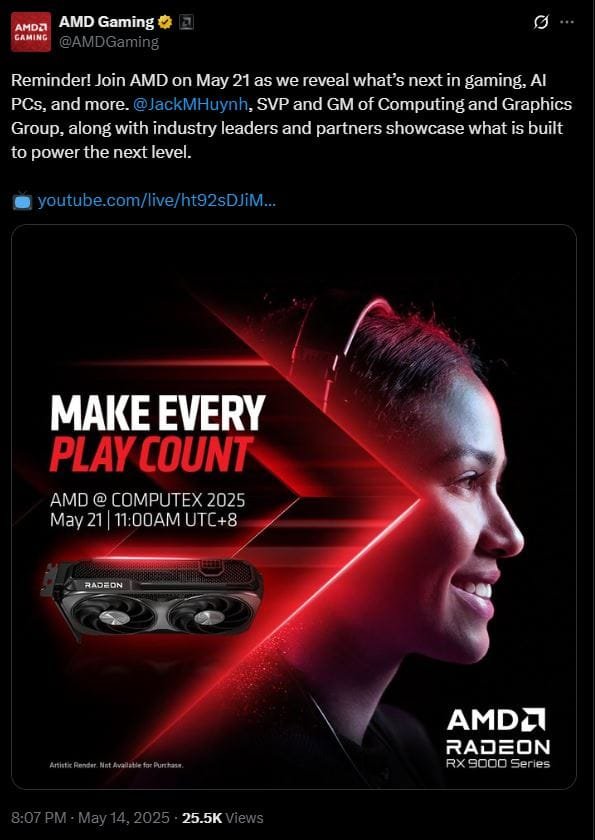 AMD is set to make significant announcements at Computex 2025, with a press conference scheduled for Wednesday, May 21, at 11:00 AM Taipei time. Jack Huynh, Senior Vice President and General Manager of AMD’s Computing and Graphics Group, will lead the event, focusing on advancements in gaming, AI PCs, and enterprise solutions. Unfortunately, AMD has once again clarified that the image is an artistic interpretation and not an actual reference design. AMD will not be selling this model directly, meaning the RX 9060 XT will be another RDNA4 launch limited to board partners.