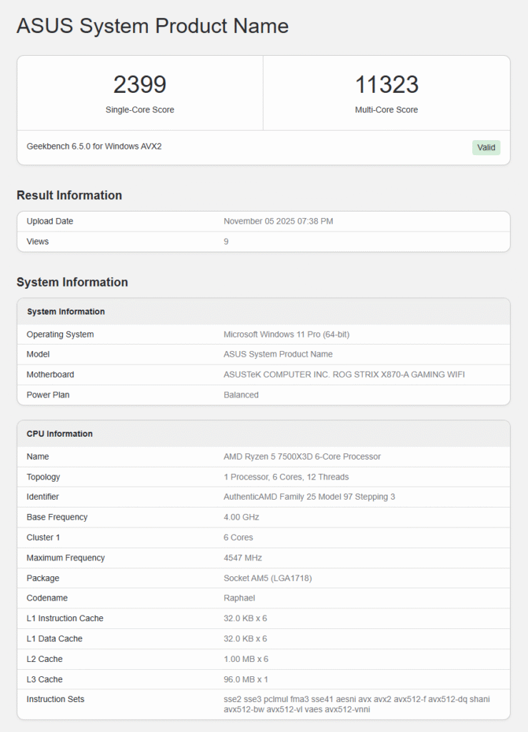 The AMD Ryzen 5 7500X3D, a budget-oriented Zen 4-based processor featuring AMD’s 3D V-Cache technology, has surfaced in a Geekbench 6 benchmark, hinting at an impending launch as the most affordable six-core X3D CPU for the AM5 socket. This leak, spotted on the Geekbench browser under a test run on an ASUS ROG Strix X870-A Gaming WiFi motherboard running Windows 11 with a balanced power plan, confirms the chip’s existence and provides early insights into its capabilities. Built on the Raphael architecture, the Ryzen 5 7500X3D packs six cores and 12 threads, with a base clock speed of 4.0 GHz and a boost clock reaching up to 4.6 GHz, though some reports note a slightly lower 4.5 GHz peak. It boasts an impressive 96 MB of L3 cache—comprising 32 MB of standard cache stacked with 64 MB of 3D V-Cache for enhanced gaming performance—and a total cache footprint of around 102 MB when including L2. With a 65W TDP matching its higher-clocked sibling, the Ryzen 5 7600X3D, it positions itself as a power-efficient option for gamers seeking high frame rates without breaking the bank, potentially succeeding the older Ryzen 5 5500X3D from the Zen 3 era.