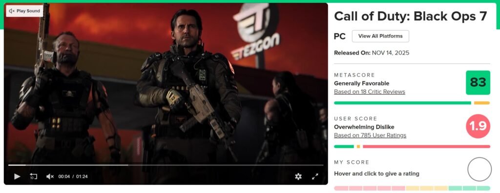 The new game Call of Duty: Black Ops 7 from Activision just came out, but many players are very upset. On the website Metacritic, the average score from users is only 1.9 out of 10, based on 285 reviews as of November 17, 2025. These are mostly from regular players, not experts. The reviews are all from the launch day, and they don’t show names to keep people private. Fans who have played the series for years feel like the game let them down big time.