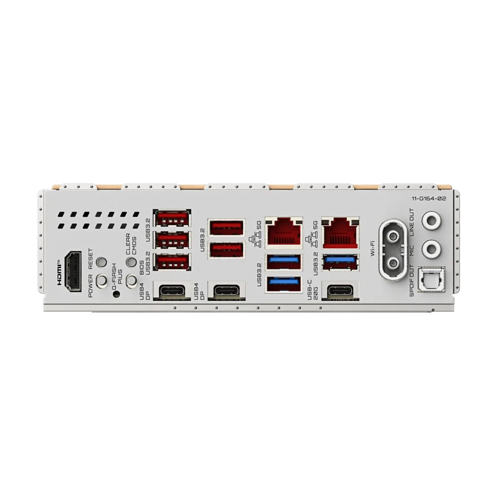 Connectivity shines with dual 5GbE LAN ports for robust wired networking, Wi-Fi 7 supporting 320 MHz channels via a directional ultra-high gain antenna and the convenient WIFI EZ-Plug for effortless setup, alongside dual USB4 Type-C ports offering 40Gb/s speeds with DisplayPort Alt Mode, one USB 3.2 Gen2x2 Type-C, five USB 3.2 Gen2, three USB 3.2 Gen1, and HDMI output for versatile peripherals. Audio enthusiasts will appreciate the Hi-Fi setup with Realtek ALC1220 codec, 8-channel HD audio, and high-end capacitors. Cooling is comprehensive and advanced, featuring VRM Thermal Armor Advanced with direct-touch heatpipes and 7 W/mK thermal pads for 10x surface area dissipation, M.2 Thermal Guard L and Ext. covering six optimized zones with backplates, the patented M.2 EZ-Flex baseplate cooling SSDs by up to 12°C, and a PCB Thermal Plate delivering 14% better thermal performance alongside small vents reducing temperatures by up to 7°C; Smart Fan6 software manages eight PWM/DC headers with dual curve modes for precise airflow.