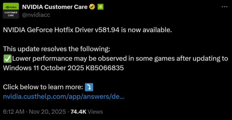 NVIDIA has released GeForce Hotfix Display Driver version 581.94, a beta driver based on the latest Game Ready Driver 581.80, designed to deliver targeted fixes more quickly without waiting for a full WHQL-certified release. This hotfix addresses a specific performance issue where lower frame rates and slowdowns may be observed in some games following the installation of the Windows 11 October 2025 cumulative update KB5066835, which impacts systems on Windows 11 24H2 or 25H2 builds and certain newer updates incorporating the same code changes. The driver provides a workaround to restore gaming performance affected by this Microsoft update, and the fix—along with many others—will be integrated into the next official Game Ready Driver release, after which the hotfix will be discontinued.