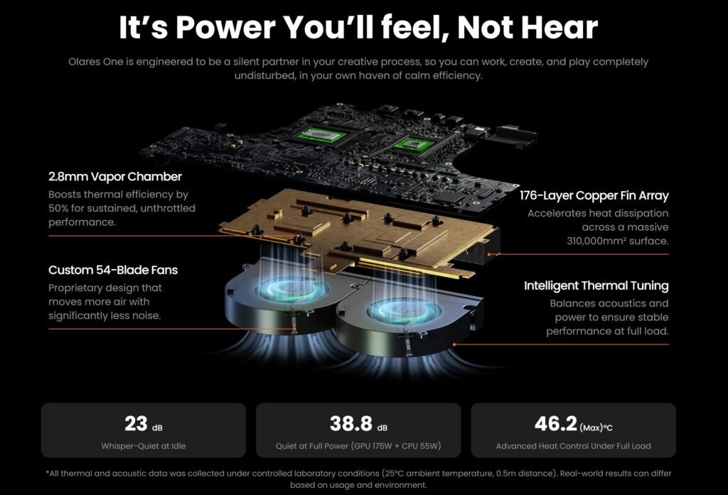 At the heart of Olares One is a compact 3.5-liter mini PC chassis measuring 320 x 197 x 55 mm and weighing 2.15 kg (or 3.1 kg including the power supply), engineered for efficient cooling with a 2.8 mm vapor chamber, dual 54-blade fans, and a copper fin array that keeps noise levels at 23 dB during idle and 38.8 dB under full load, while maintaining component temperatures around 46°C. The device boasts impressive hardware specifications, including an Intel Core Ultra 9 275HX processor with 24 cores (8 performance and 16 efficiency cores), capable of boosting up to 5.4 GHz with 36 MB of cache; an NVIDIA GeForce RTX 5090 Mobile GPU featuring 24 GB of GDDR7 memory, a maximum TGP of 175W, and up to 1824 AI TOPS for intensive local inference tasks; 96 GB of DDR5-5600 RAM configured in two 48 GB SODIMM slots; and a 2 TB PCIe 4.0 NVMe SSD for storage. Connectivity is robust, with support for WiFi 7 and Bluetooth 5.4 wireless standards, a 2.5 Gb Ethernet port, Thunderbolt 5, a single USB Type-A port, and HDMI 2.1 output, all powered by a 330W external brick.