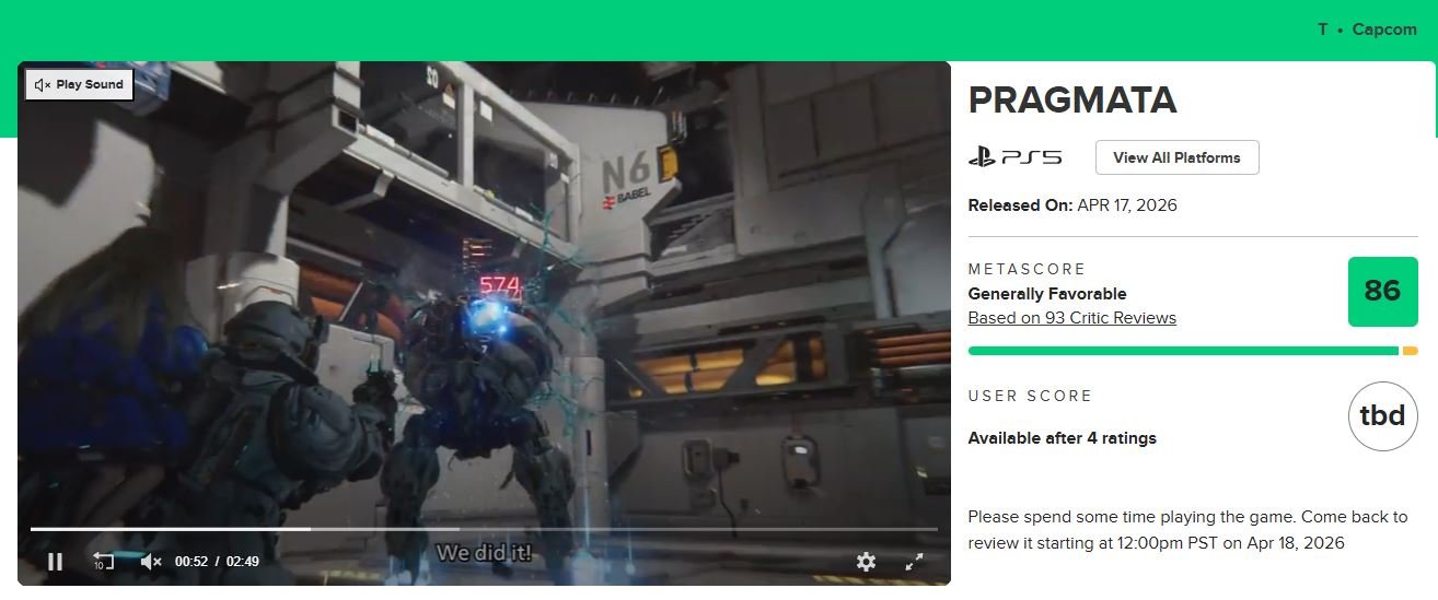 Pragmata holds an 86 score on Metacritic, reflecting strong critical reception across major media outlets. Below are review scores from leading publications that highlight the game’s overall positive consensus.
