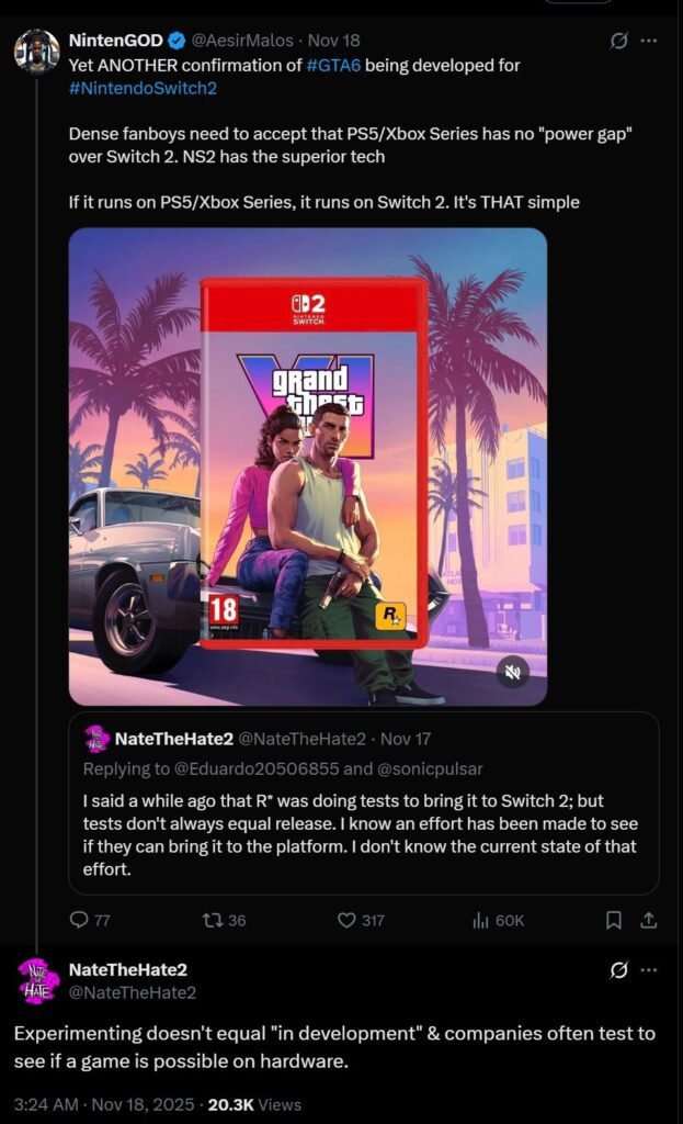 Recent rumors about GTA 6 possibly coming to the Nintendo Switch 2 are getting a lot of attention. Many gamers are talking about it because well-known leakers, including NateTheHate, have shared reports that make the rumor seem more believable. According to NateTheHate, Rockstar Games has been conducting tests to determine if the ambitious open-world title can feasibly run on the upcoming Switch 2 hardware, an effort he first heard about some time ago. However, he has repeatedly emphasized that such experimentation does not equate to active development or a guaranteed port, as companies routinely probe hardware limits without committing to a release—citing past examples like Rockstar’s unsuccessful tests for GTA V on the Wii U. This speculation aligns with broader industry chatter, including claims from Twitter user Nash Weedle, who asserted that a Switch 2 version is in the works but would not launch alongside the confirmed PlayStation 5 and Xbox Series X|S editions on November 19, 2026, and that the game’s recent delay from its original 2025 target has nothing to do with Nintendo’s console.