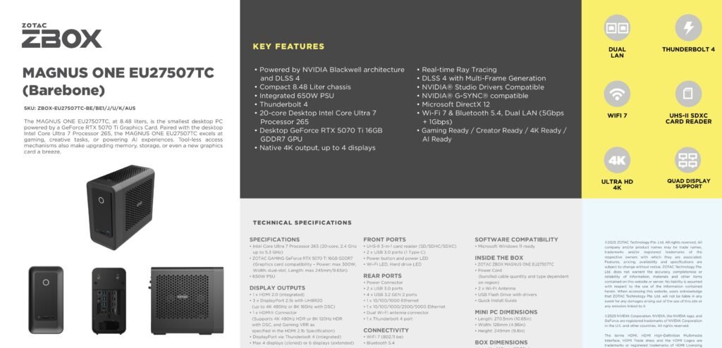 ZOTAC has introduced the ZBOX MAGNUS ONE EU27507TC, a compact high-performance desktop PC built as a barebone system. It can house a full desktop-grade GeForce RTX 5070 Ti graphics card with 16 GB of GDDR7 memory, making it the smallest complete system to support this powerful Blackwell-based GPU. Designed for gamers, creators, and edge computing users, this model continues the ZBOX Magnus series focus on delivering desktop-level performance in a very small 8.48-liter case, measuring 270.5 × 126 × 249 mm, about the size of a gaming console but much more capable. The system is powered by an Intel Core Ultra 7 265 processor from the Arrow Lake-S family, offering 20 cores and boost speeds up to 5.3 GHz. A 650 W 80+ Platinum power supply ensures it can handle all these high-demand components without any compromise.